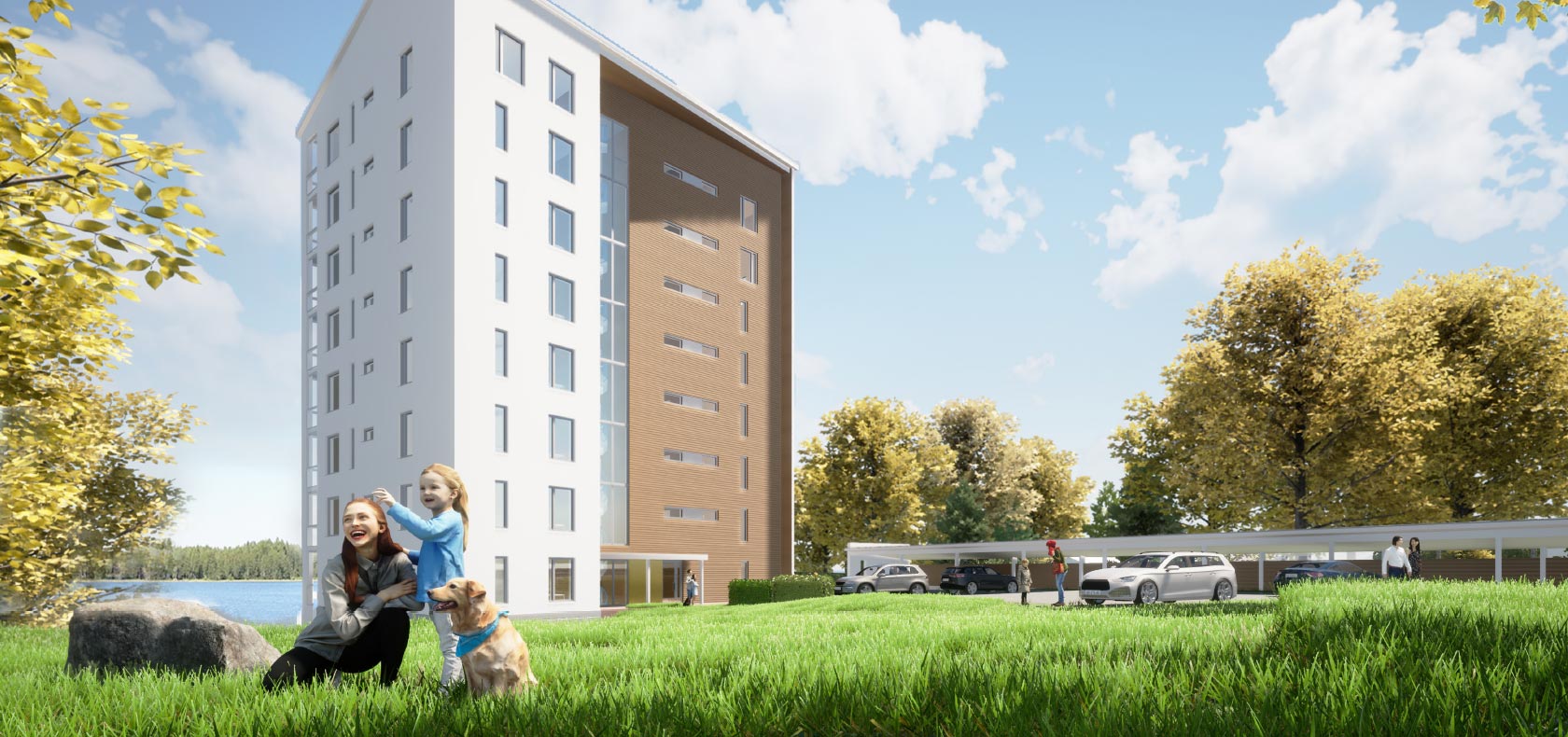 Korkeatasoista kerrostaloasumista Muuramen keskustaan järvinäkymillä.